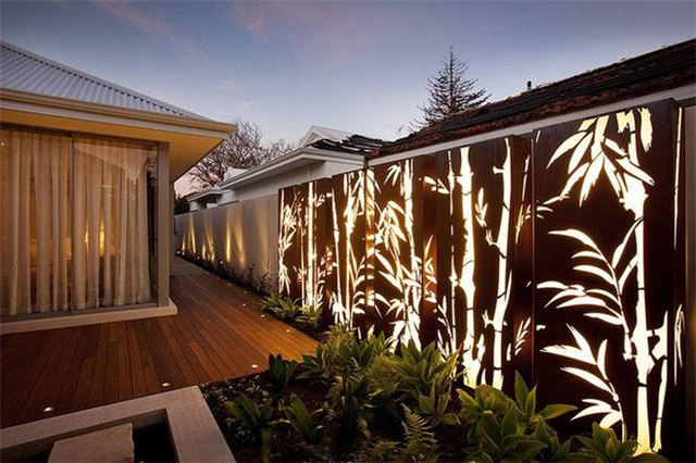 景墻形式也是多種多樣的,一般根據(jù)材料、斷面的不同,有高矮、曲直、虛實(shí)、光潔、粗糙、有椽無椽等形式。庭院設(shè)計(jì)中景墻既要美觀,又要堅(jiān)固。常用材料有磚、混凝土、花格圍墻、石墻、鐵花格圍墻等。庭院設(shè)計(jì)中常將這些墻巧妙地組合與變化,并結(jié)合樹、石、建筑、花木等其他因素,以及墻上的漏窗、門洞處理,形成空間有序、富有層次、虛實(shí)相間、明暗變化的靜觀效果。